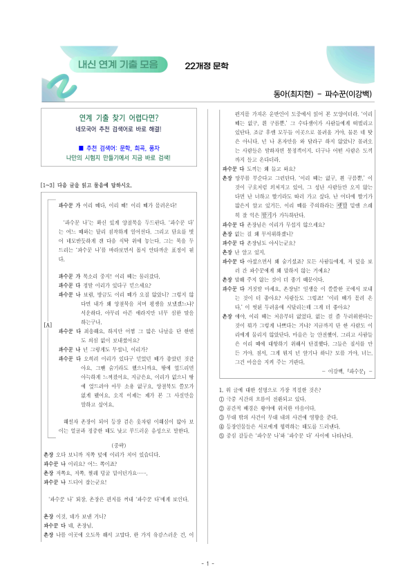 2022 개정 고2 문학 동아(최지현) 이강백 - 파수꾼/내신/기출문제/분석/해석/오답정리/본문