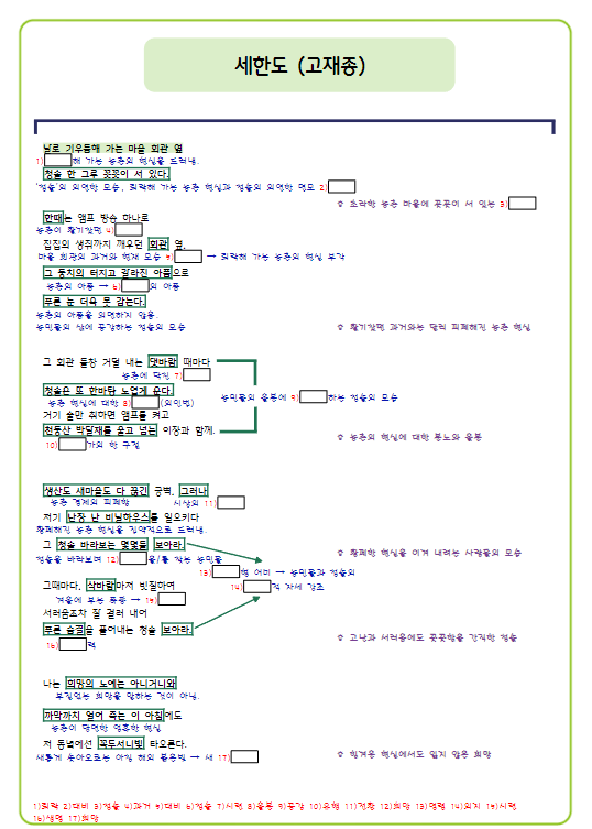 | [네모국어][고전시가] 절명시(황현) 문제 및 정답 (0) | 2024.10.14 |