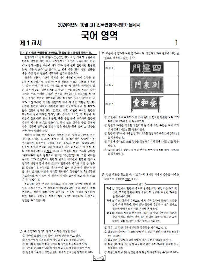 [2024 고1 10월] 전국연합학력평가(모의고사) 국어