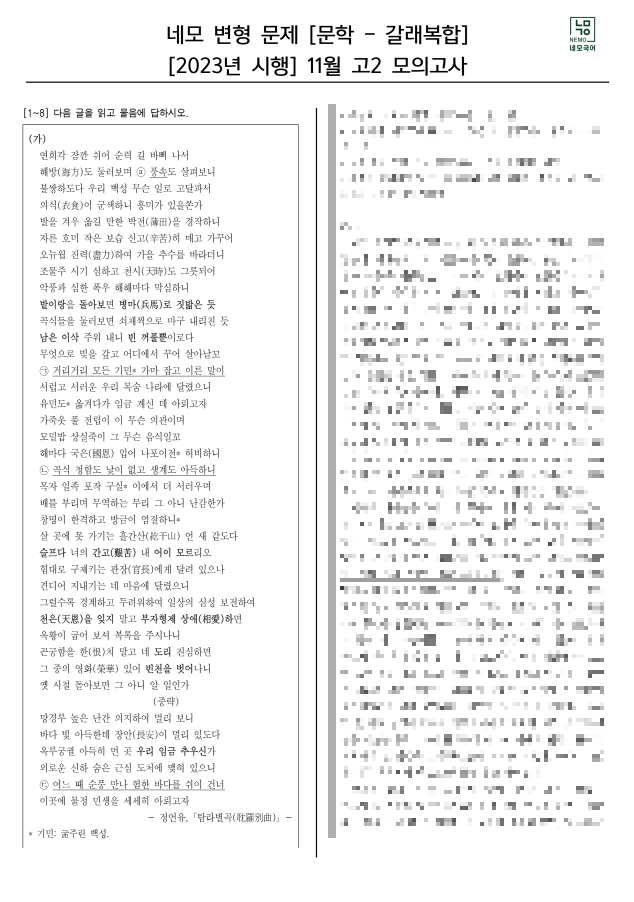 | [네모국어][2019 고3 4월] 문학(갈래복합) - 겨울 뜸부기(오정희), 천년학(이청준) 변형 문제 PDF (7) | 2024.11.06 |