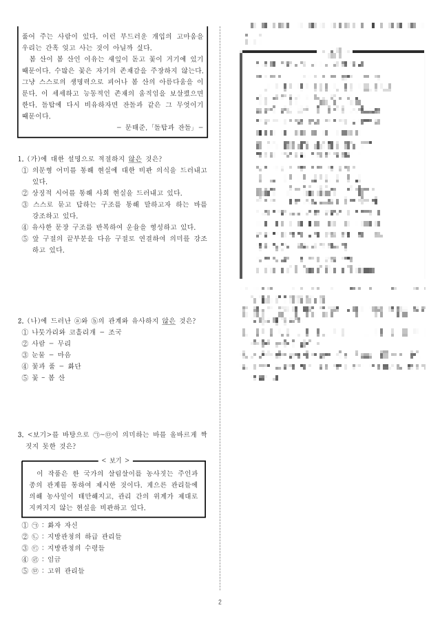 | [네모국어][2022 고2 3월] 문학(현대시) - 그 복숭아나무 곁으로(나희덕), 잔디에게 덜 미안한 날(복효근) 변형 문제 PDF (0) | 2025.01.22 |