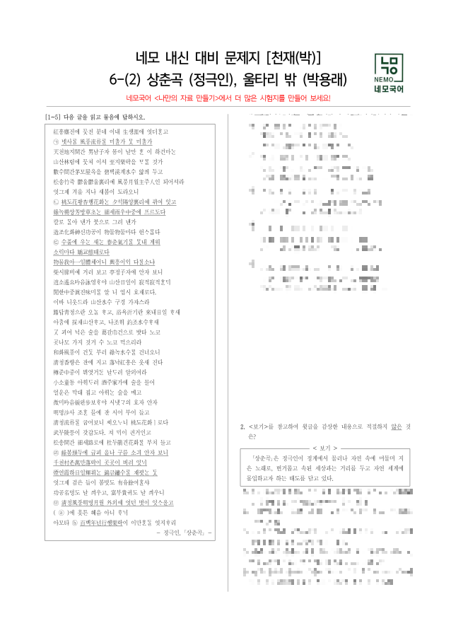 | [네모국어][고전시가] 천재(박영목) 상춘곡(정극인) 기출·분석·문제·정답·해설 PDF (0) | 2024.06.19 |